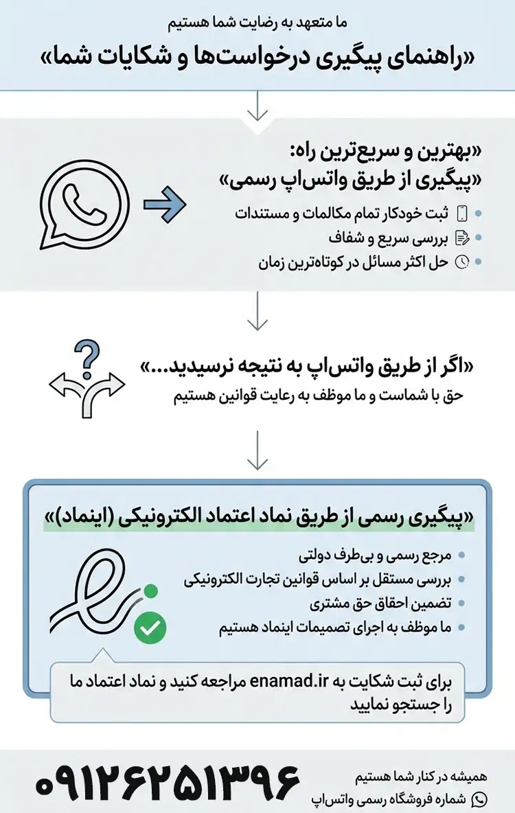 بهترین و سریع‌ترین راه برای ثبت و پیگیری درخواست‌ها، شکایات، گارانتی و مرجوعی کالا، پیگیری از طریق واتس‌اپ رسمی فروشگاه است.
